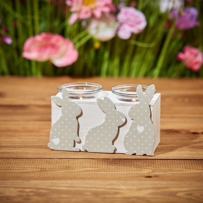 Brighten up your Easter decor with LANGS's Bunny Double Tealight Holder! This unique candle holder features three charming dotted bunnies, adding a playful touch to your holiday ambiance. It is the perfect addition to any Easter celebration. Hop to it and grab yours now!