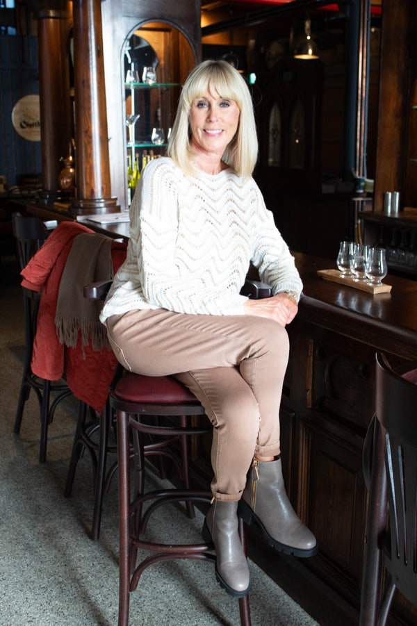 ACTUELLE : Lurex Chevron Boat Neck Sweater - Cream
