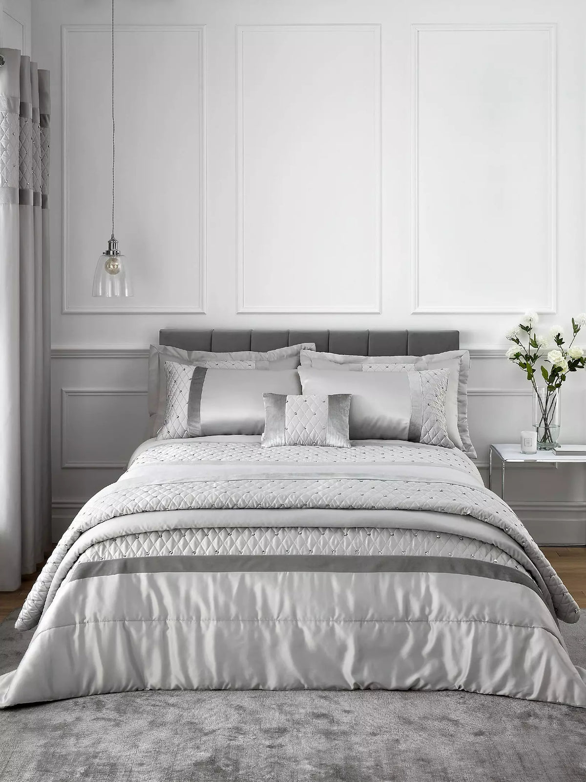 Elevate your bedroom with the luxurious CATHERINE LANSFIELD Sequin Cluster Duvet Cover Set in Silver. Featuring sparkling embellishments and a crisp white design, this set brings an instant touch of sophistication to any room. The silver quilted border and deep grey edging add subtle contrasts for a truly elegant look. Includes one duvet cover and two pillowcases.