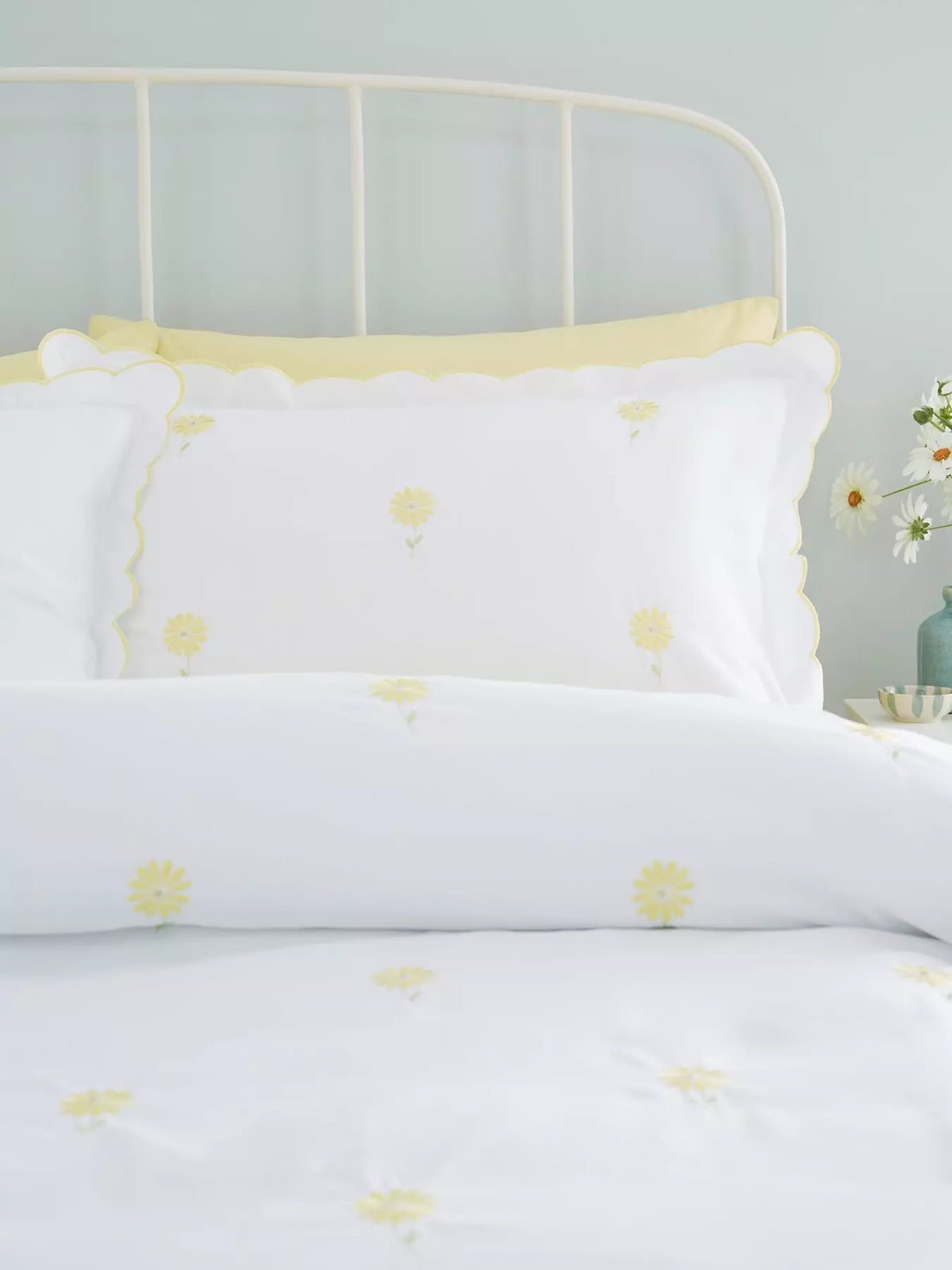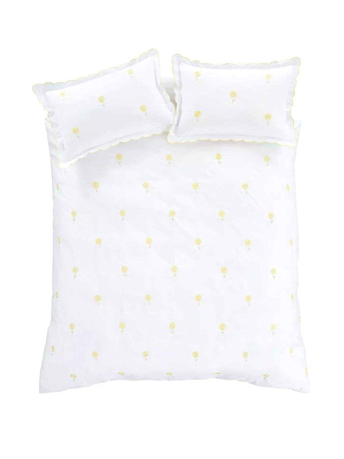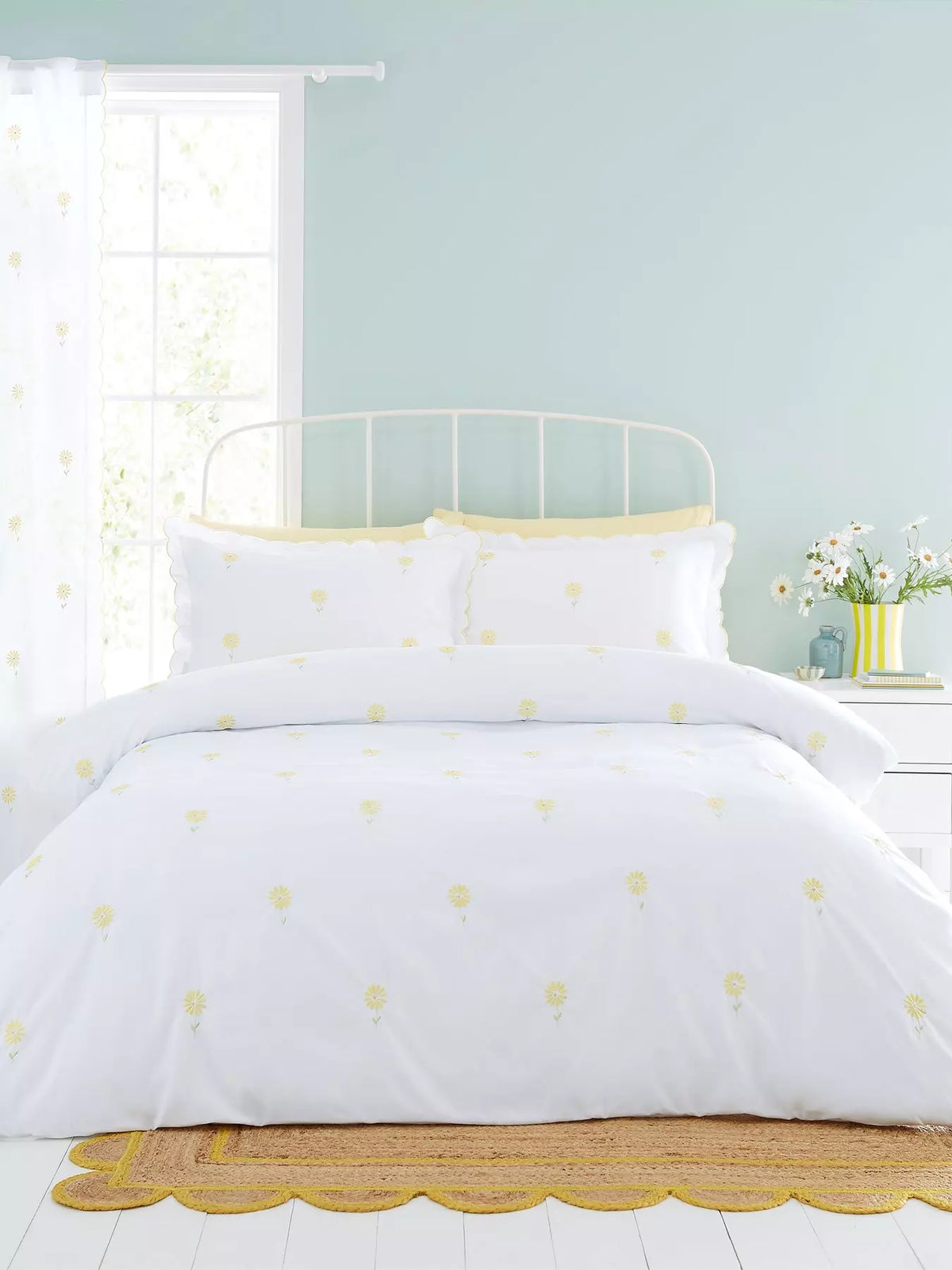 Elevate your bedroom with the CATHERINE LANSFIELD Lorna Embroidered Daisy Duvet Set. This high-quality, spring-inspired set features intricately embroidered daisies in soft shades of yellow and green on a crisp white background. The vintage button closure and decorative scalloped edges on the pillowcases add a charming touch to your sleep space.
