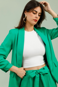 This elegant women's blazer and trouser suit set from COPE CLOTHING is tailored to fit, providing a perfect silhouette with every wear. The belt cinches in the waist for a polished, contemporary look.